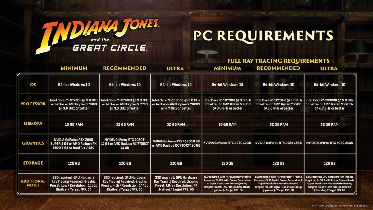 Με ανάρτηση της η εταιρία μας αποκάλυψε μια σειρά από διαφορετικές απαιτήσεις υλικού, συμπεριλαμβανομένων των Minimum, Recommended και Ultra απαιτήσεων, καθώς και των απαιτήσεων Ray Tracing. Η Bethesda επιβεβαίωσε επίσης ότι απαιτείται SSD για την εκτέλεση του Indiana Jones and the Great Circle. Αν μη τι άλλο θα πρέπει το PC να είναι αυτό που αποκαλούμε "τούμπανο" για να μπορέσει να απολαύσει κάποιος το παιχνίδι και ελπίζω να ανταποκρίνεται στις προσδοκίες των παιχτών.
