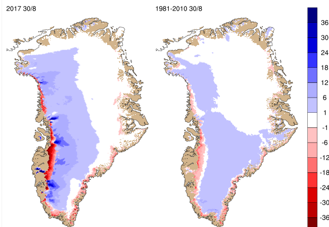 Σύμφωνα με δεδομένα του nature.com, ο συνολικός ρυθμός απώλειας πάγου επιβραδύνθηκε σε 222 δισεκατομμύρια τόνους ετησίως μεταξύ 2013 και 2017, κατά μέσο όρο, καθώς η ατμοσφαιρική κυκλοφορία ευνοούσε ψυχρότερες συνθήκες [πηγή], κάτι που μας δείχνει ότι είναι συχνό φαινόμενο η αυξομείωση της θερμοκρασίας στην Γροιλανδία.