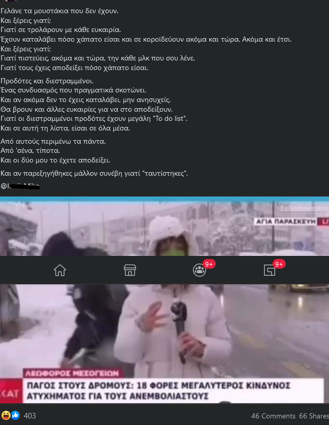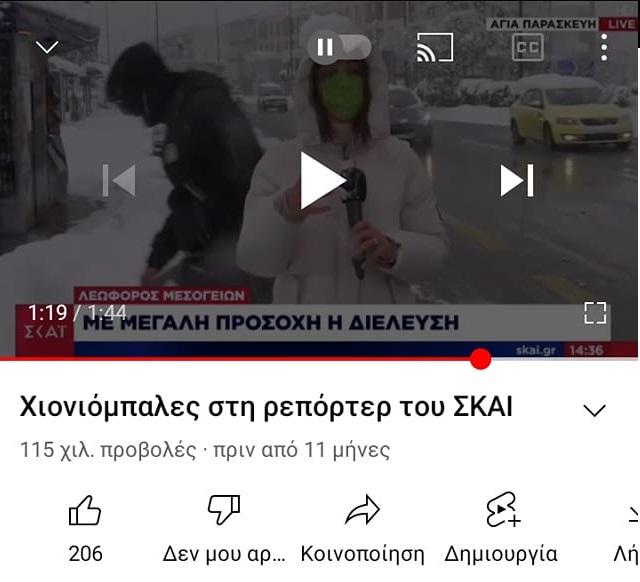 Η φωτογραφία εμφανίζει μια δημοσιογράφο του τηλεοπτικού σταθμού ΣΚΑΪ να κάνει ρεπορτάζ σε χιονισμένη περιοχή και από κάτω η λεζάντα γράφει "Πάγος στους δρόμους. 18 φορές μεγαλύτερος κίνδυνος για τους ανεμβολίαστους".