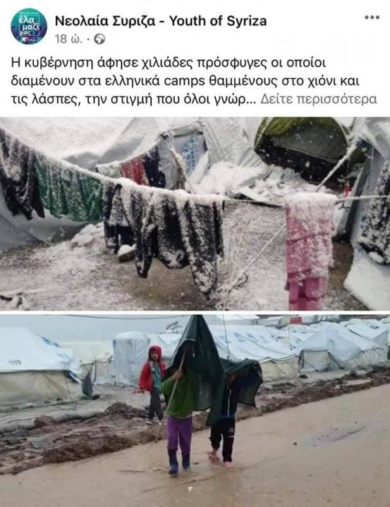 Στο κείμενο που συνόδευε την φωτογραφία, η νεολαία Σύριζα αναφέρεται στο γεγονός ότι οι μετανάστες είναι θαμμένοι κάτω από χιόνι και λάσπες.