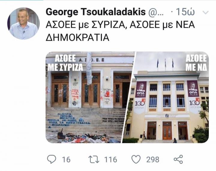 Κυκλοφορεί μια φωτογραφία στα μέσα κοινωνικής δικτύωσης, η οποία δείχνει το Οικονομικό Πανεπιστήμιο Αθηνών (πρώην ΑΣΟΕΕ) με Σύριζα και με ΝΔ. Όμως η φωτογραφία είναι παραπλανητική.