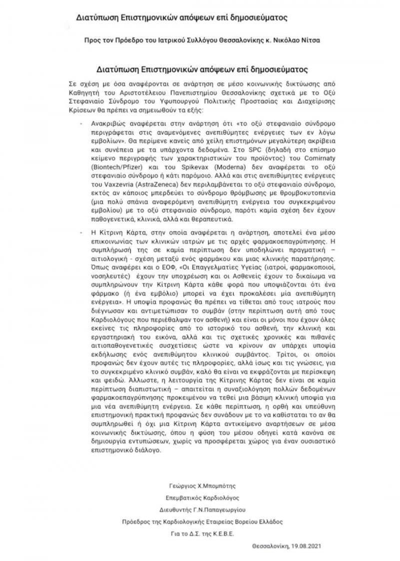 Επίσης, στις 19-8-2021, ο πρόεδρος της Καρδιολογικής Εταιρείας Βορείου Ελλάδος, Γεώργιος Χ. Μπομπότης, διάψευσε με επιστολή του τον ισχυρισμό περί αναμενόμενης σύνδεσης του οξύ στεφανιαίου συνδρόμου με τον εμβολιασμό κατά της COVID-19.