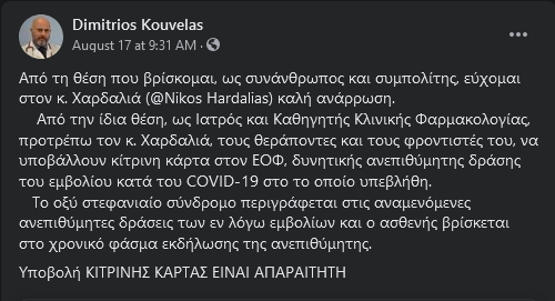 Η Ελληνική Καρδιολογική Εταιρία (ΕΚΕ), απάντησε σε αυτήν του την ανάρτηση "ότι καμία συσχέτιση εμβολίων και οξέων ισχαιμικών επεισοδίων, δεν έχει αποδειχθεί ούτε αναφερθεί με τη χρήση των μέχρι τώρα εμβολίων, τόσο στις κλινικές δοκιμές τους όσο και στην εφαρμογή τους στον γενικό πληθυσμό" [πηγή].