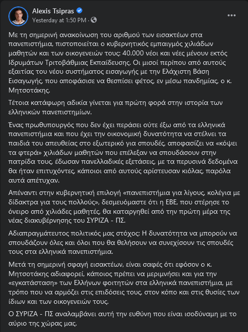 Στην δήλωση του στον λογαριασμό του στο Facebook, ο Αλέξης Τσίπρας έκανε λόγο για 40 χιλιάδες νέες και νέους.