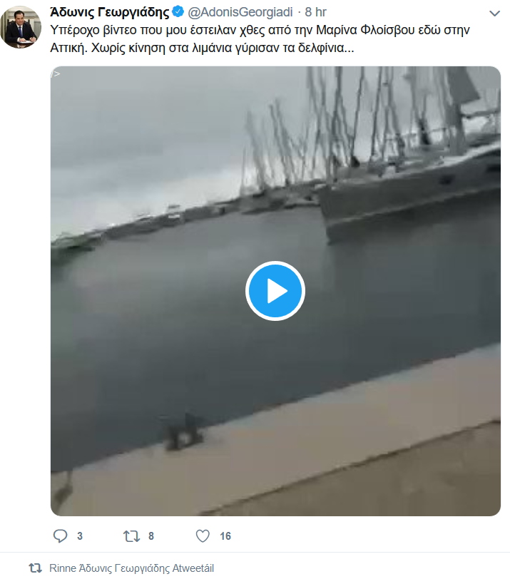 Στο βίντεο που δημοσίευσε, και το οποίο όπως ο ίδιος έγραψε, του το έστειλε κάποιος άλλος χρήστης, φαίνονται δελφίνια να κολυμπούν αμέριμνα στη Μαρίνα Φλοίσβου, αποτέλεσμα, όπως τόνισε ο κ. Γεωργιάδης, της απαγόρευσης κυκλοφορίας που οδήγησε στη μείωση της κίνησης στα λιμάνια και έδωσε τη δυνατότητα στα δελφίνια να επιστρέψουν.